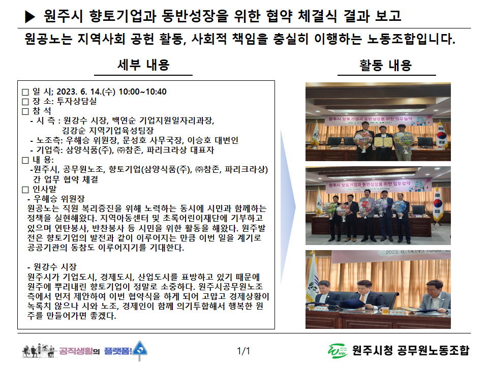 원주시 향토기업과 동반성장을 위한 협약 체결식 결과 보고(2023.6.14.)