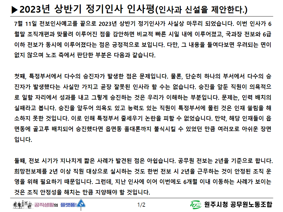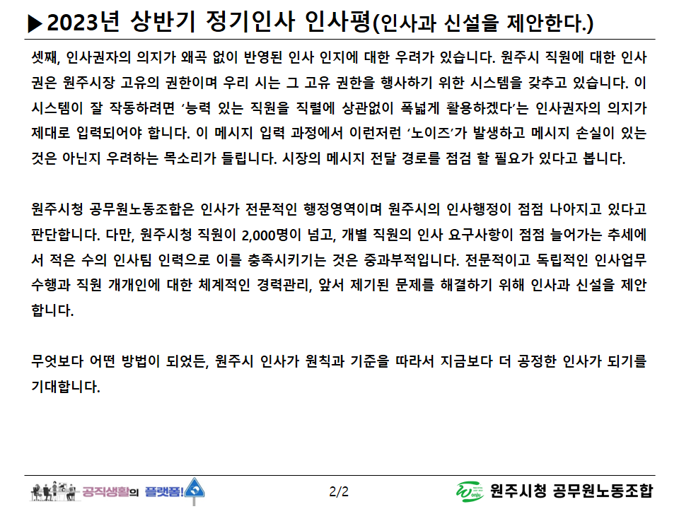 2025년 하반기 정기인사 전 원주시청 공무원노동조합 입장문
