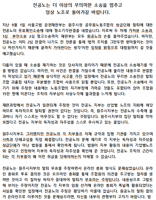 시설관리공단과 중부지역일반노동조합의 갈등에 대한 원주시청 공무원노동조합 입장문