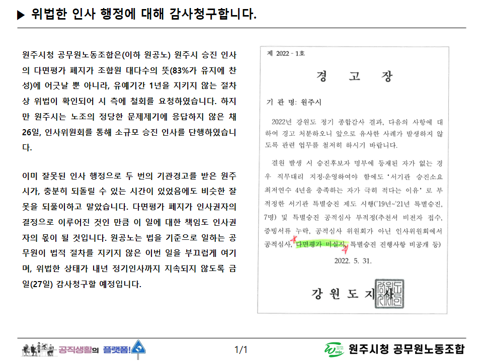 원주시의 일방적인 다면평가 폐지관련 재감사 요구