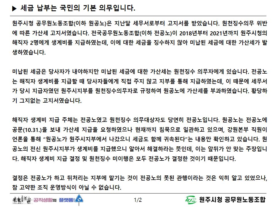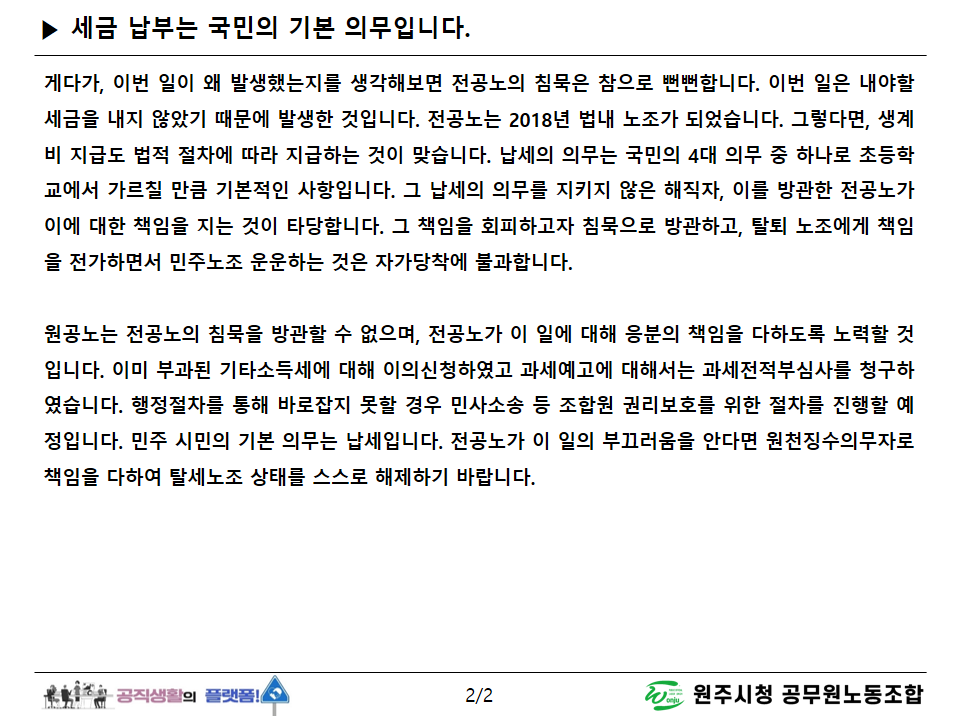 시설관리공단과 중부지역일반노동조합의 갈등에 대한 원주시청 공무원노동조합 입장문