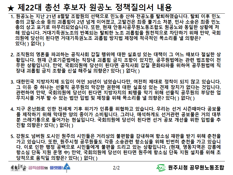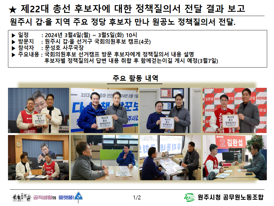원주시청 공무원노동조합 제3대 임원 선거 출마자