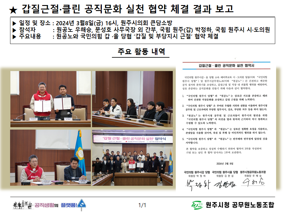 원공노와 국힘 갑·을 당협 갑질근절·클린 공직문화 실천 협약서(2024.3.8.)
