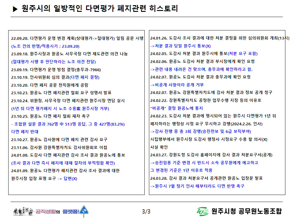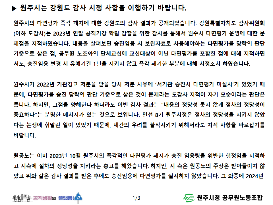 원주시의 일방적인 다면평가 폐지관련 재감사 요구
