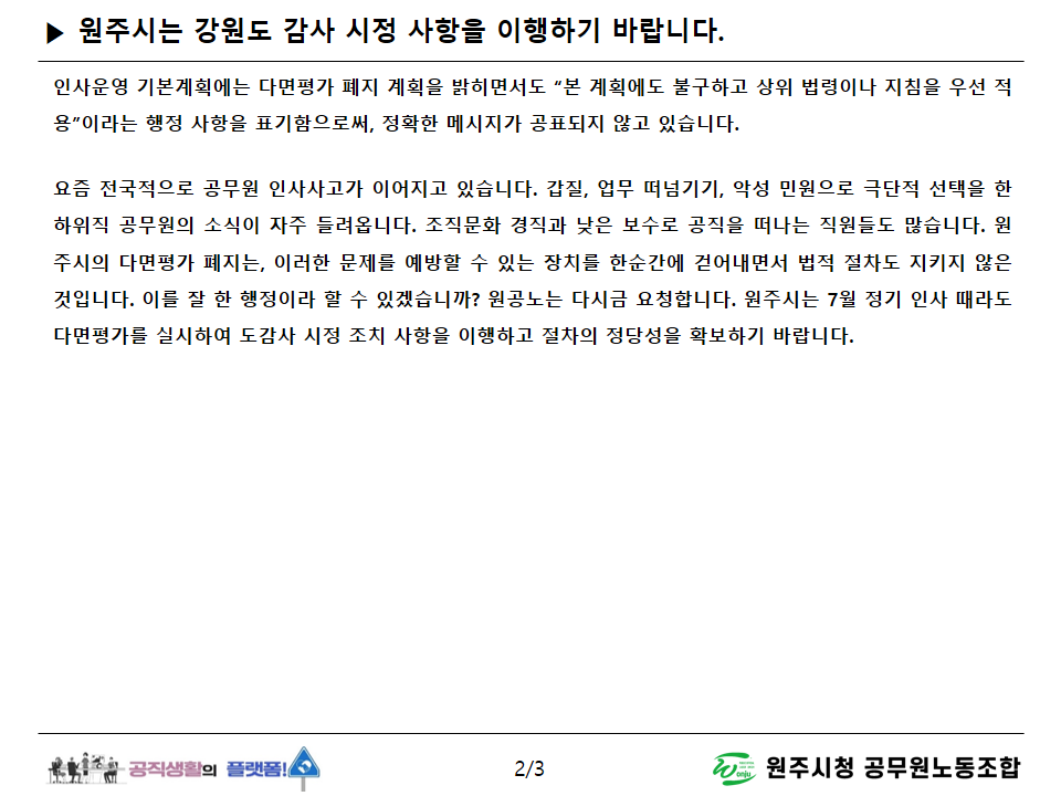 2025년 하반기 정기인사 전 원주시청 공무원노동조합 입장문