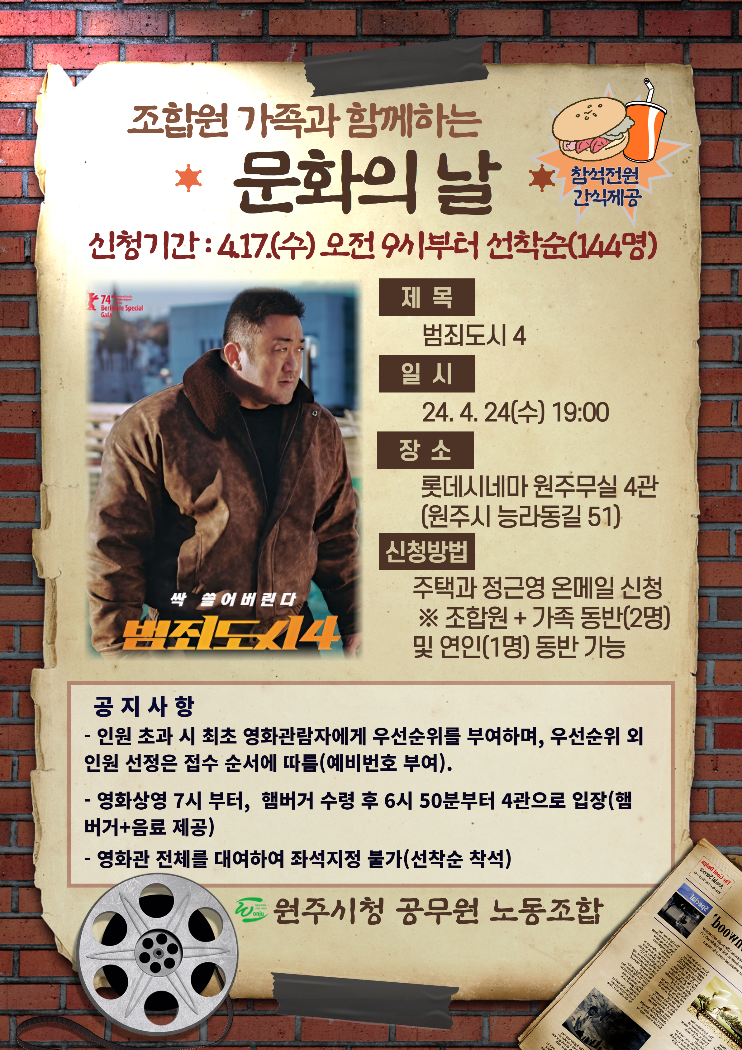 조합원과 함께하는 단체 영화관람 이벤트[범죄도시4 / 4.24.(수) 19:00]