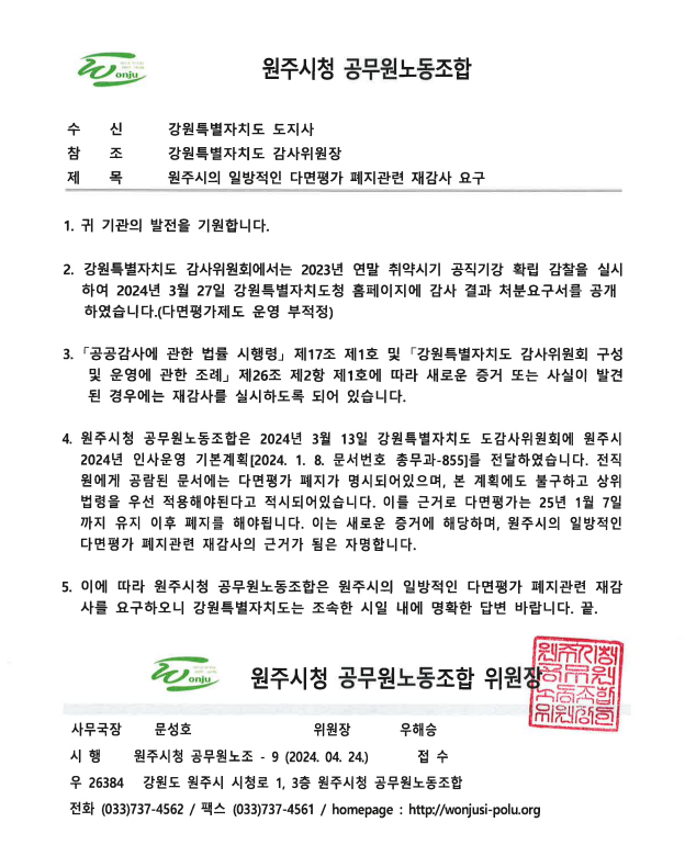 원주시의 일방적인 다면평가 폐지관련 재감사 요구