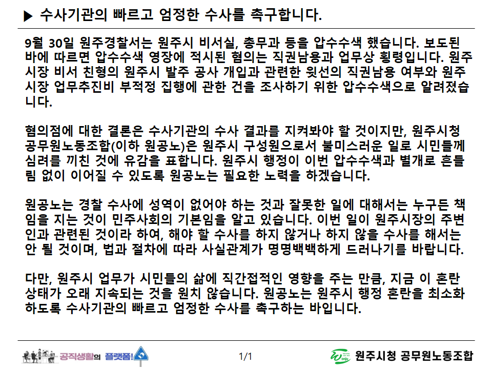 원주봉산일반산업단지 논란에 대한 원주시청 공무원노동조합 입장문