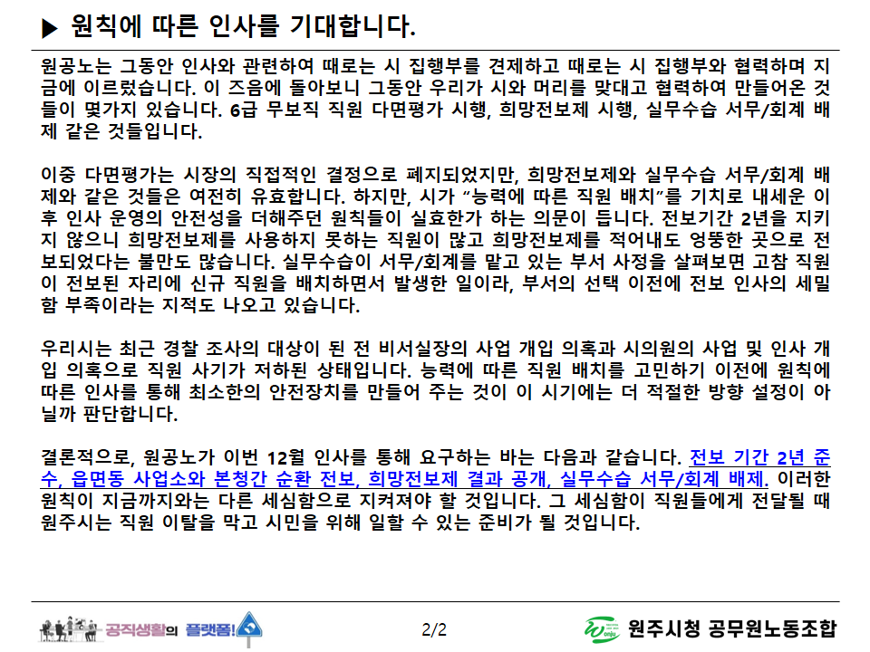 2025년 하반기 정기인사 전 원주시청 공무원노동조합 입장문