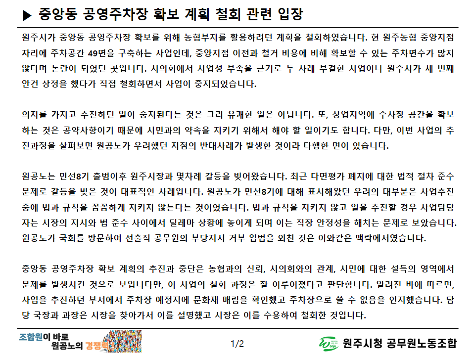 시설관리공단과 중부지역일반노동조합의 갈등에 대한 원주시청 공무원노동조합 입장문