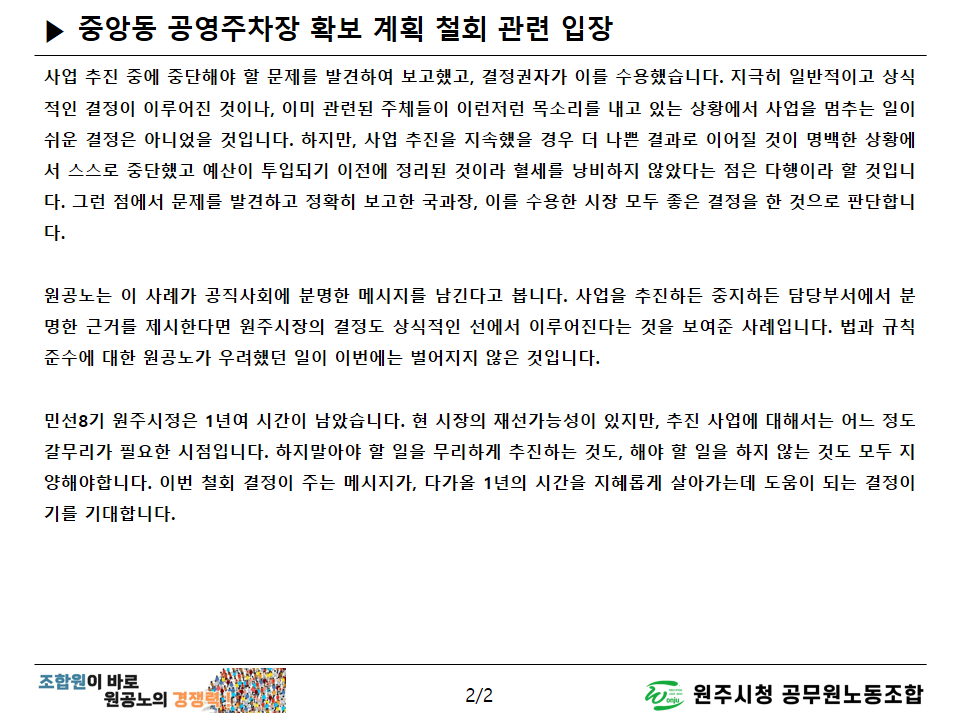원주봉산일반산업단지 논란에 대한 원주시청 공무원노동조합 입장문
