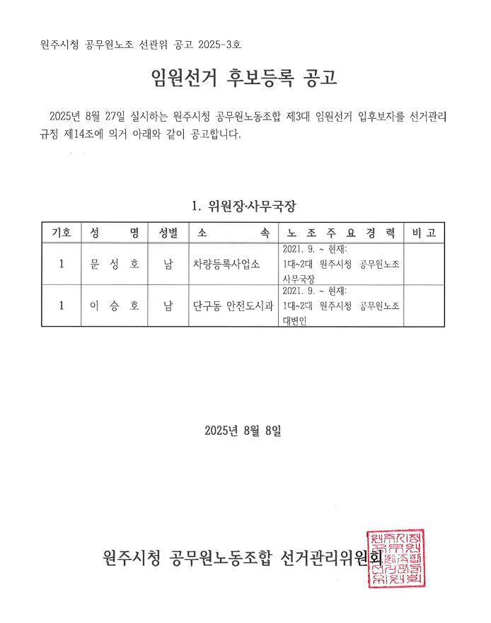 원주시청 공무원 노동조합 임원 선거 후보등록 공고