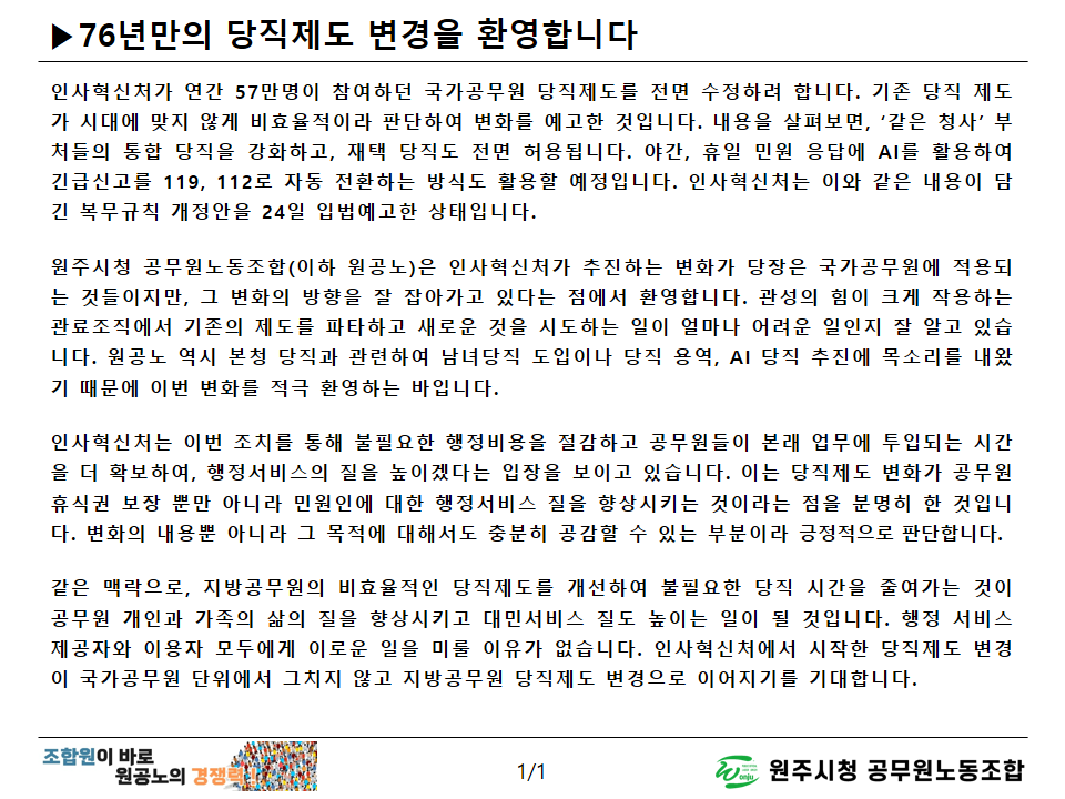 2026년 상반기 정기인사 전 원주시청 공무원노동조합 입장문