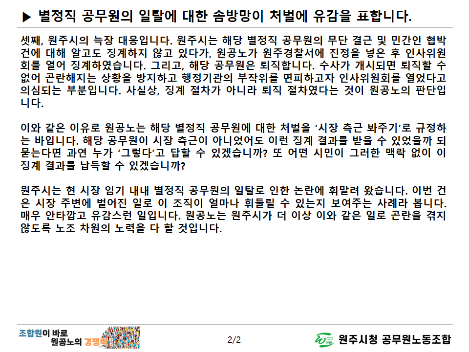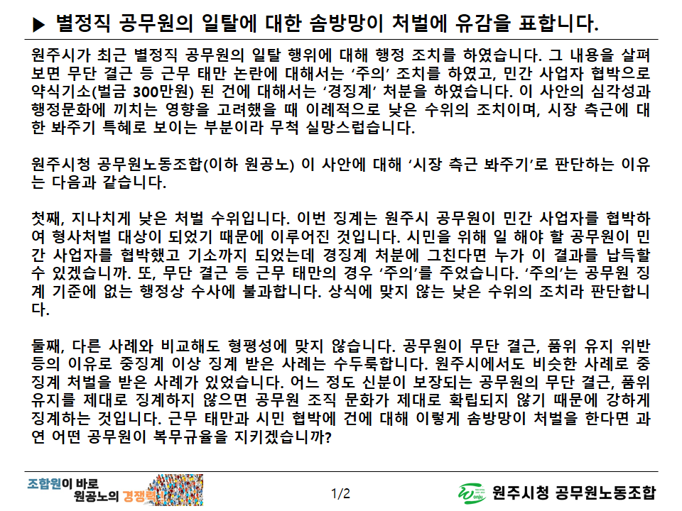 시설관리공단과 중부지역일반노동조합의 갈등에 대한 원주시청 공무원노동조합 입장문