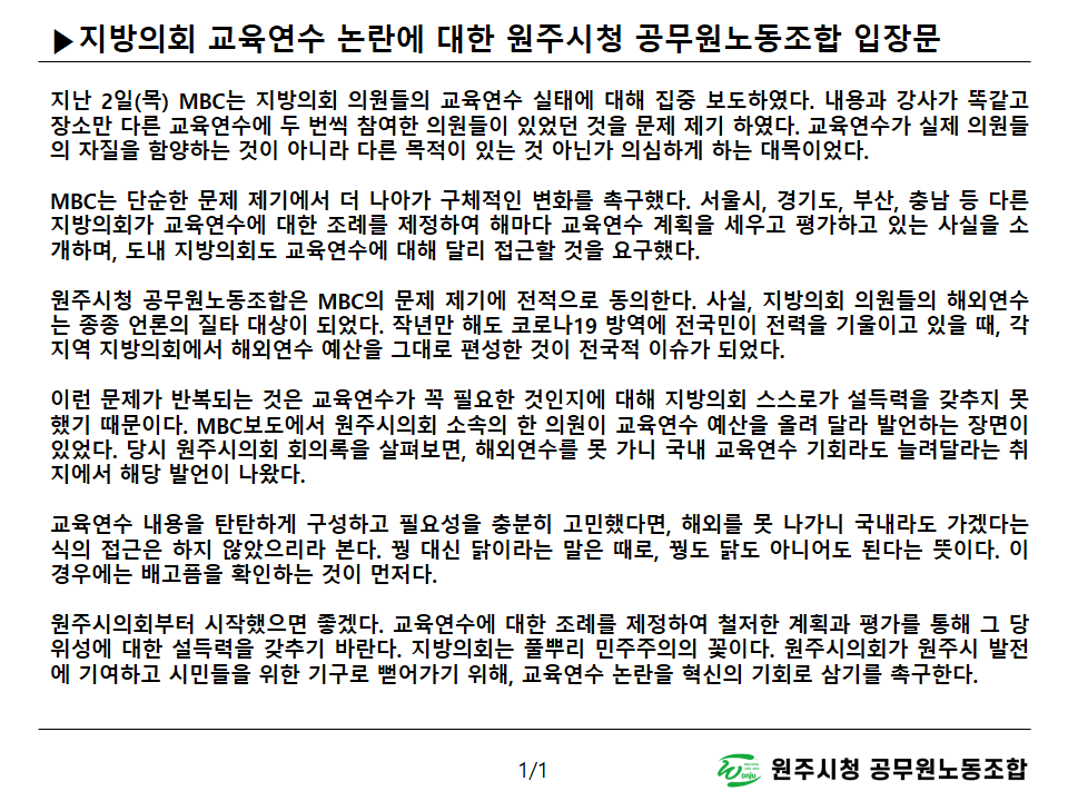 원주시의회와 원주시의 해외출장 추진 중단을 환영합니다.