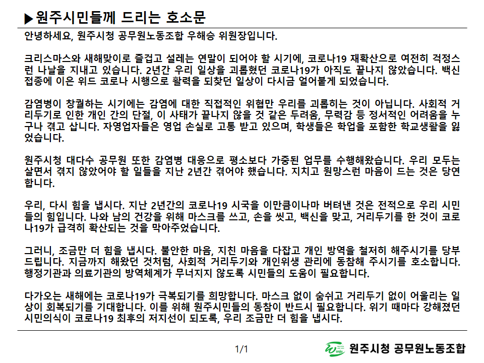 시설관리공단과 중부지역일반노동조합의 갈등에 대한 원주시청 공무원노동조합 입장문
