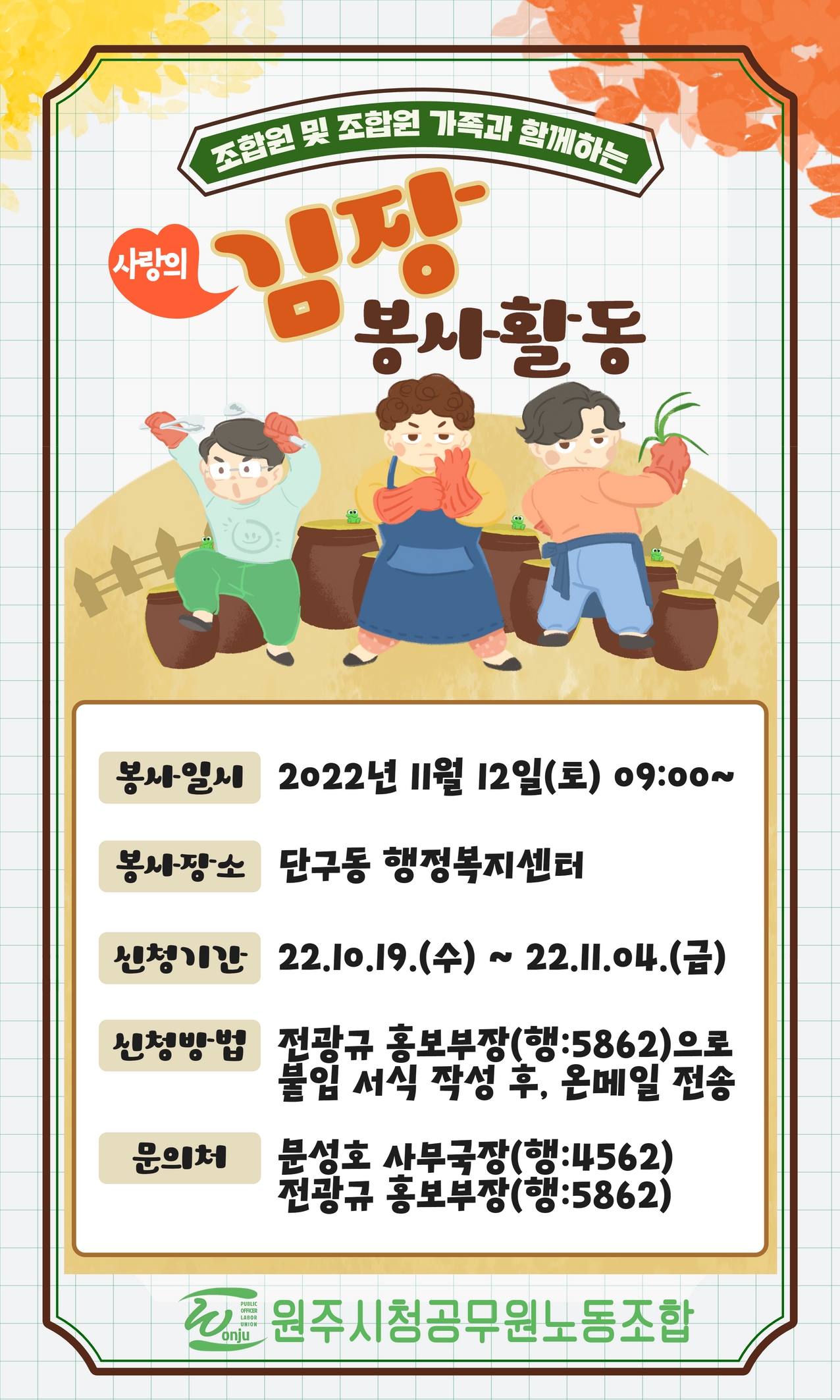 2025년 조합원 및 조합원 가족과 함께하는 사랑의 김장 봉사 활동 참여 신청 안내!!