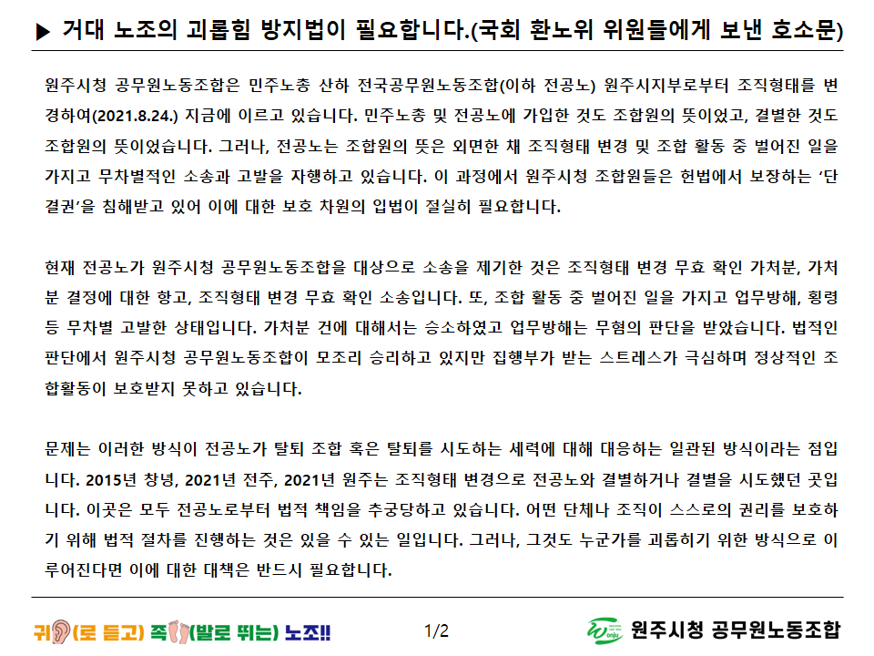원주봉산일반산업단지 논란에 대한 원주시청 공무원노동조합 입장문