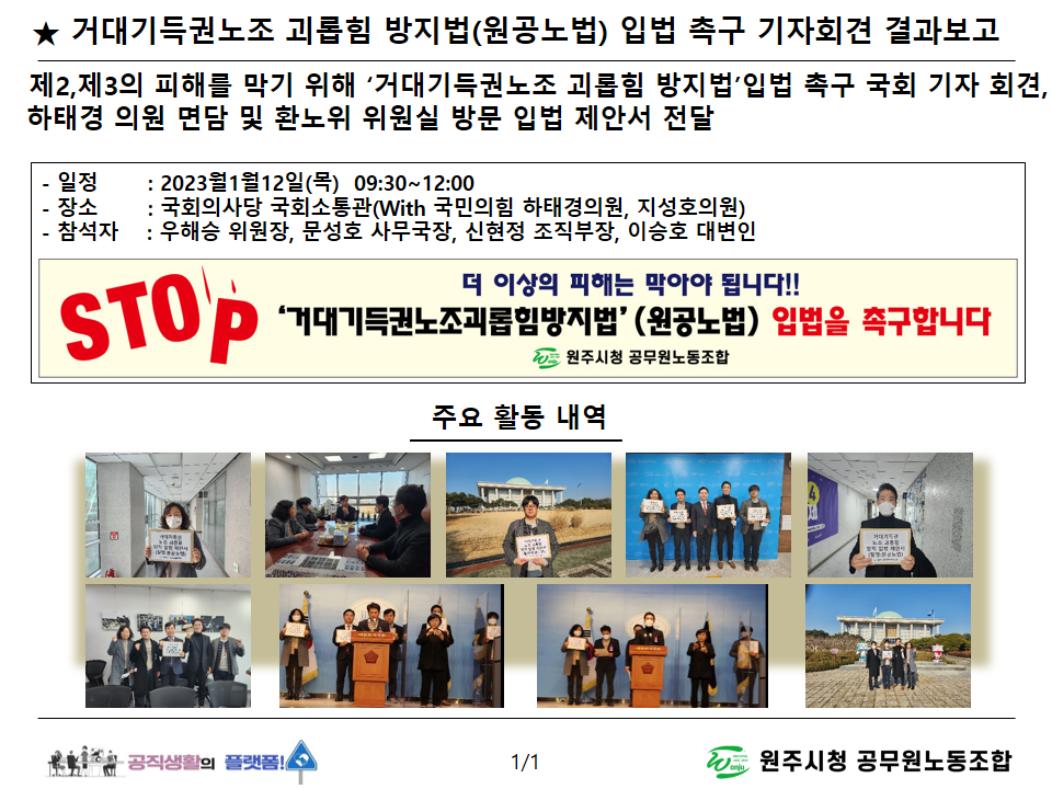 거대 기득권노조 괴롭힘 방지법(원공노법) 입법 촉구 국회기자회견 결과보고(2023.1.12.)