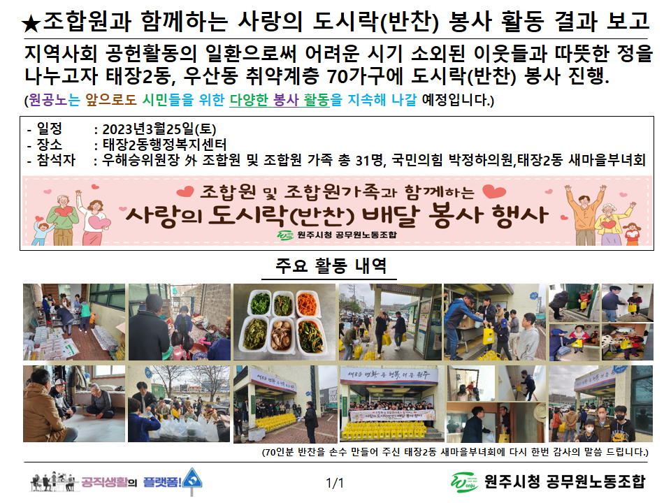 조합원 및 조합원 가족과 함께하는 사랑의 도시락(반찬)봉사 활동 결과보고(2023.3.25.)