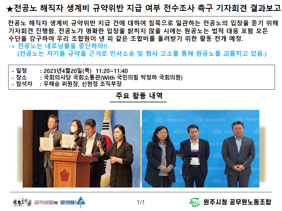 전공노 해직자 생계비 규약위반 지급 여부 전수조사 촉구 국회기자회견 결과보고(2023.4.20)