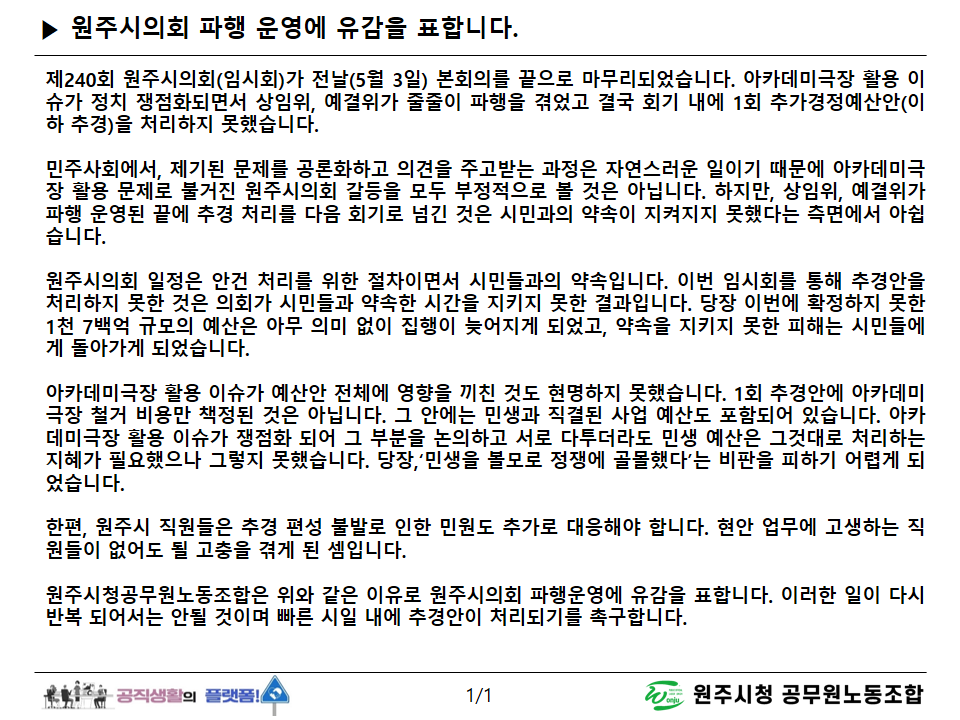 원주봉산일반산업단지 논란에 대한 원주시청 공무원노동조합 입장문